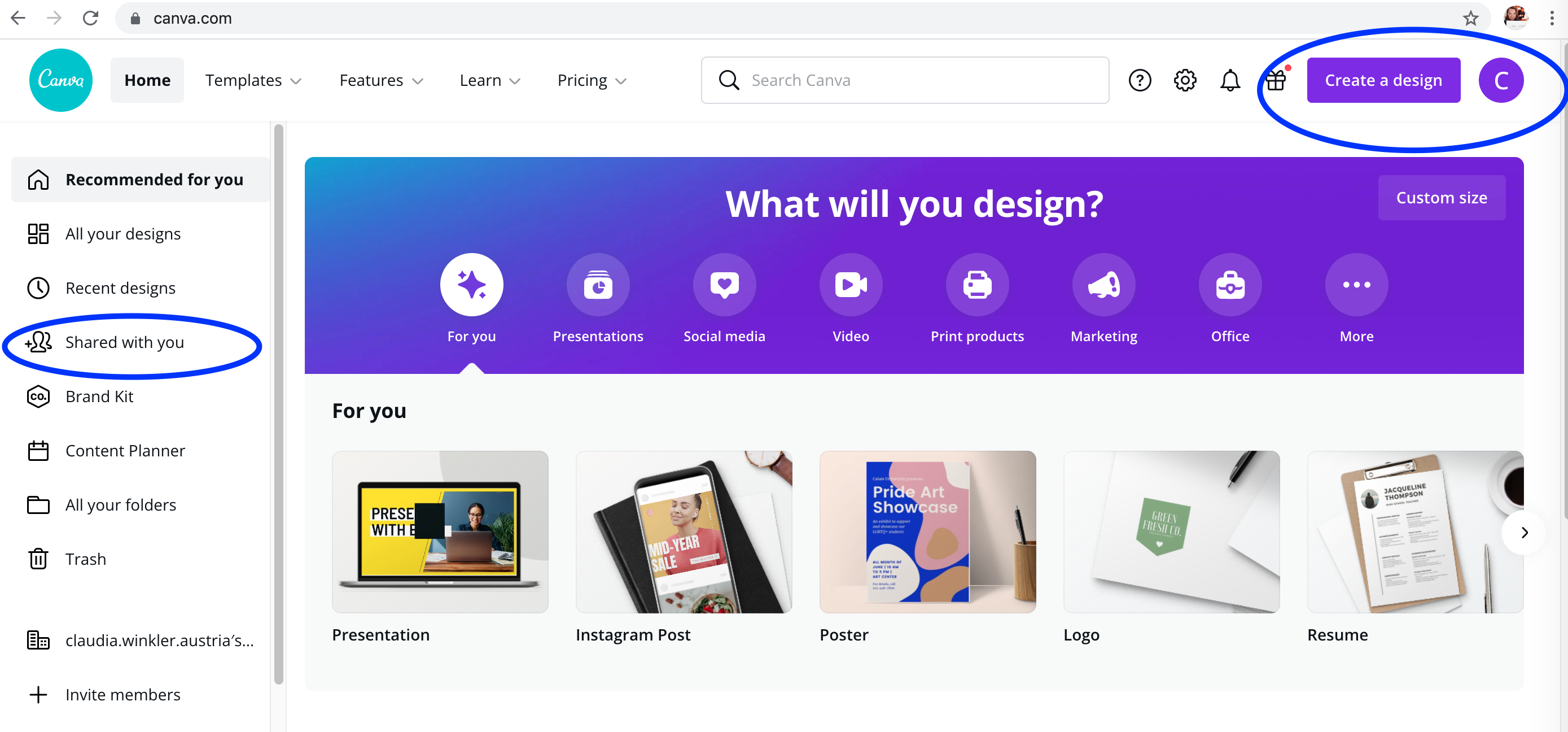 Schritt 2: In Canva einloggen, dann erscheint folgende Oberfläche