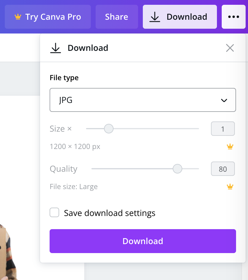 Dann Bild bearbeiten/zuschneiden, Umfärben... die Befehle auf Canva sind sehr intuititv. Wenn das Bild fertig ist mit dem Button rechts oben Download- runterladen. Im Dropdown Menü als Format bitte jpg wählen damit Format für Produktbild passt
