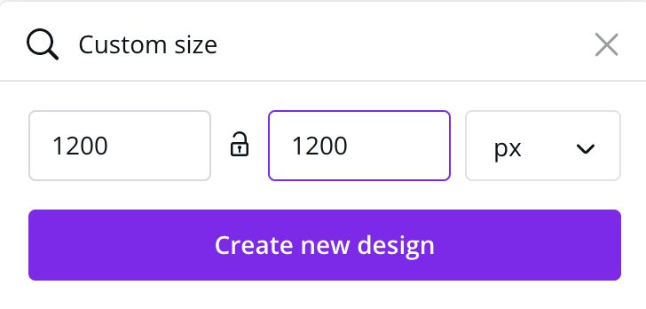 in der dann erscheinenden Box für Produktbilder 1200*1200 px eingeben und lila Button Create a Design klicken