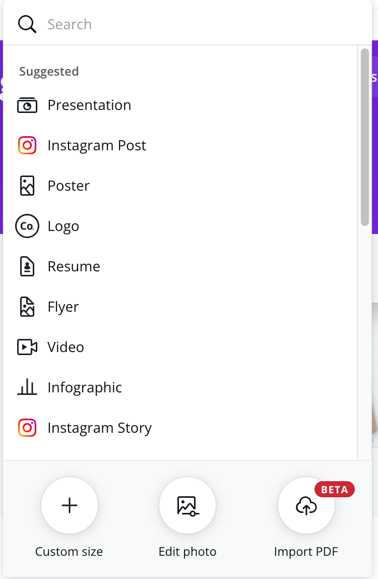 Rechts oben "Create a design" klicken und am unteren Ende des Dropdowns das eingekreiste + (custom size) klicken